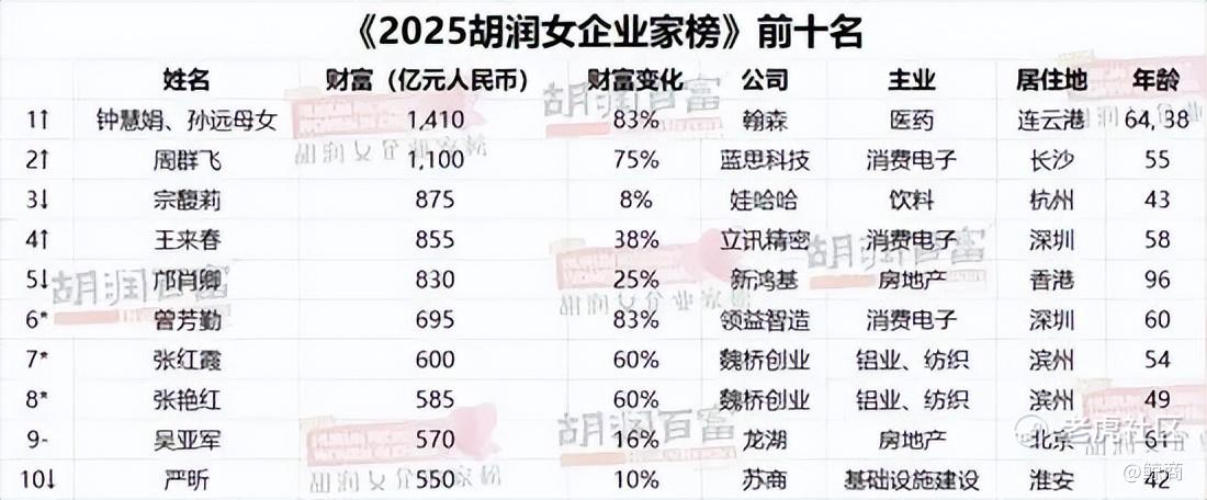 最新发布的《2025胡润百富榜》显示,钟慧娟以1410亿元财富取代了娃哈哈宗馥莉的霸主地位,成为中国新晋女首富。