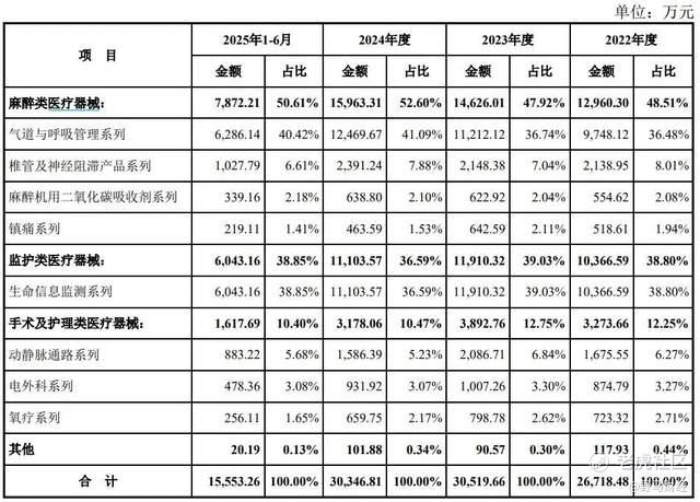 其中,麻醉类医疗器械是该公司的主要产品,近年来对营收的贡献度持续增长,收入从2022年的1.3亿元到2024年的1.6亿元,占比从48.51%增长至52.6%,超过一半。不过今年上半年麻醉类医疗器械的营收占比有所下降,为50.61%,实现收入7872.21万元。