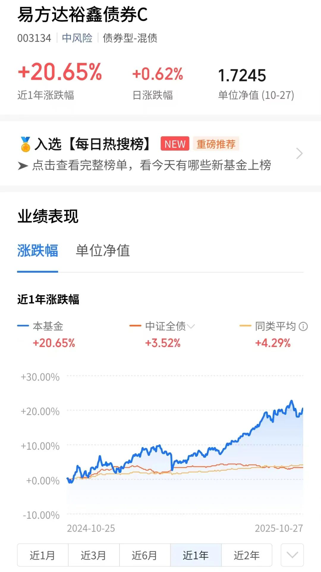 还有一只准备入手的,易方达裕鑫债券C(003134),比易方达增强回报更进取一些,近1年回报达到20.65%,最大回撤才-6.47%。在最近一年的行情里,这样的“风险收益比”真的是非常能打。