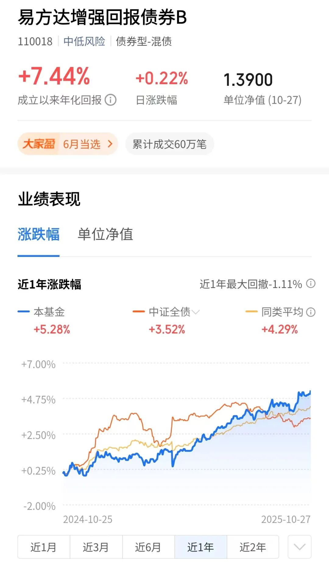 比如这只,易方达增强回报,这波下跌几乎没什么回撤,近1年回报达到5.28%,关键是,最大回撤才-1.11%,持有体验很好。