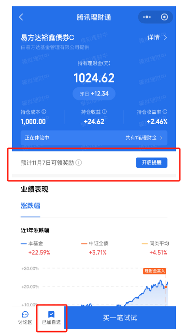 操作也很简单,点击进入下面理财通的页面,领取1000元虚拟体验金,买入易方达裕鑫债券C(003134)。持有到期后,亏了跟我们无关,如果赚钱了,收益归我们(如果收益小于0.01,最低领0.01红包;如果收益超过2,最高领2元红包),直接就能提现到微信,轻松薅羊毛。