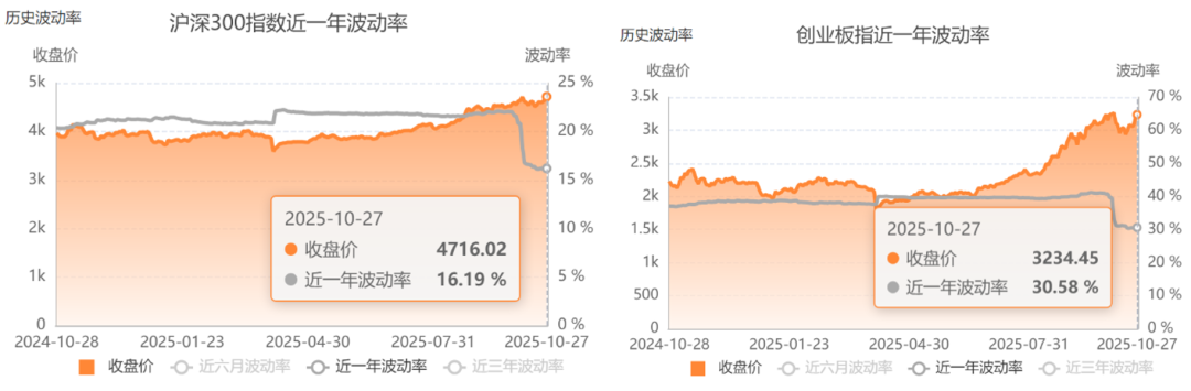 沪深300近一年的波动率是16%,创业板指数更夸张,近一年的波动率冲到了31%。