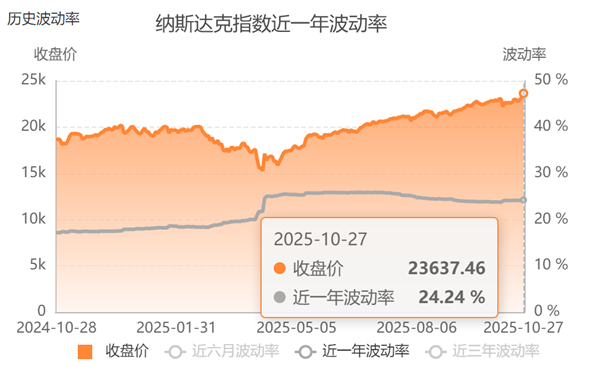 纳斯达克指数近一年波动率达到24%。也就是说,过去一年买入纳斯达克指数,涨跌幅度可能超过20%,相当于坐上了一辆刺激的“过山车”。