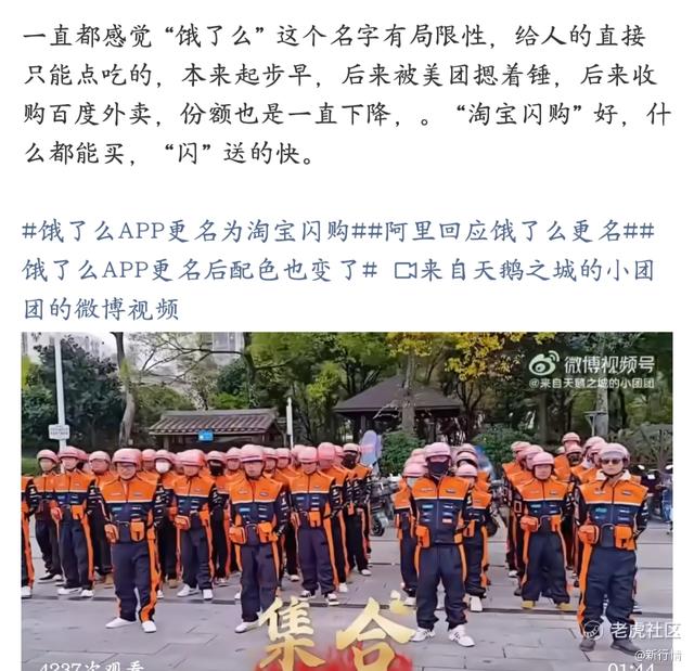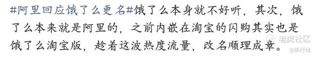 有的网友表示支持,“一直都感觉‘饿了么’这个名字有局限性,给人的直觉只能点吃的,本来起步早,后来被美团摁着锤,后来收购百度外卖,份额也是一直下降。‘淘宝闪购’好,什么都能买,‘闪’送的快。”“饿了么本身就不好听,其次,饿了么本来就是阿里的,之前内嵌在淘宝的闪购其实也是饿了么淘宝版,趁着这波热度流量,改名顺理成章。”