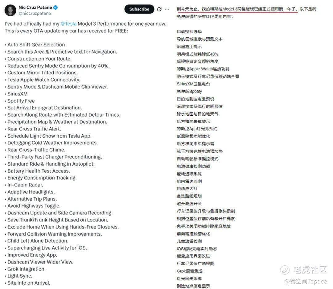 除了扎实的产品力之外,特斯拉通过不断的OTA远程软件升级为车辆增值,让消费者“不花钱”就能开新车。正如海外博主@Nic Cruz Patane 所分享的那样,他的Model 3高性能版在一年内更新内容涵盖了自动换挡、沿途施工提醒、智能儿童座椅儿童遗忘提醒等实用功能,以及车辆安全性能的持续优化。