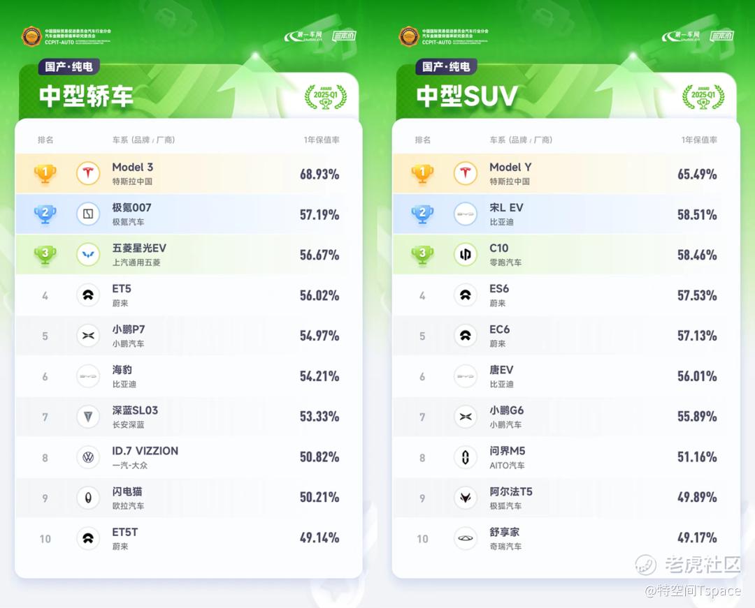 在此前第一车网发布的2025年第一季度中国乘用车保值率排行榜中,特斯拉Model 3/Y便已在各自细分市场稳居榜首,分别成为最保值的国产纯电中型轿车与最保值的纯电中型SUV,保值率表现远超同级车型。
