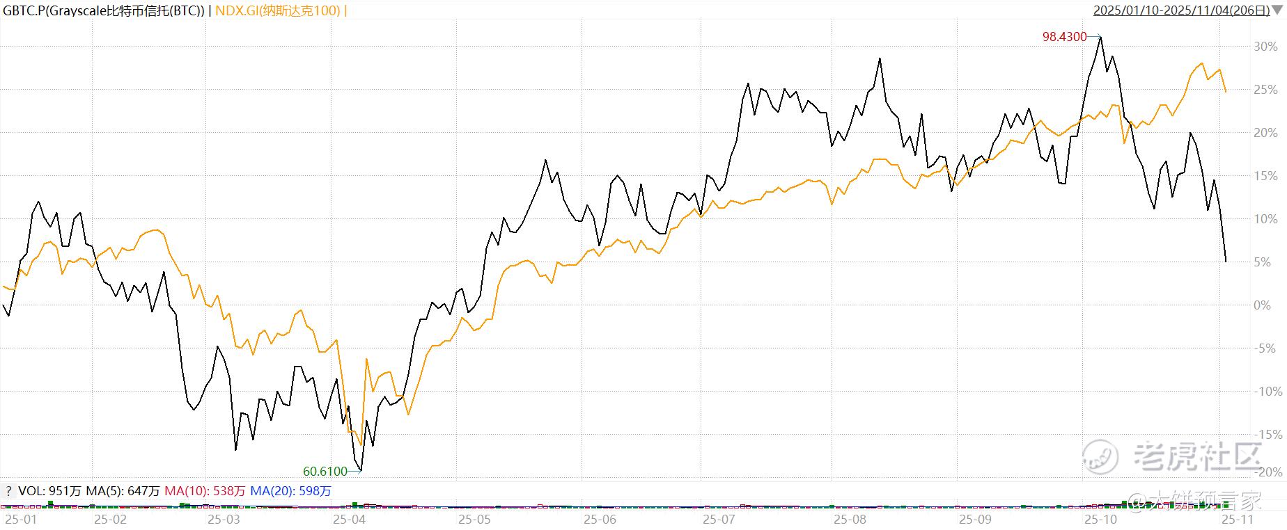 下面这张图是两者今年的走势,黑色是大饼,橙色是纳斯达克指数。