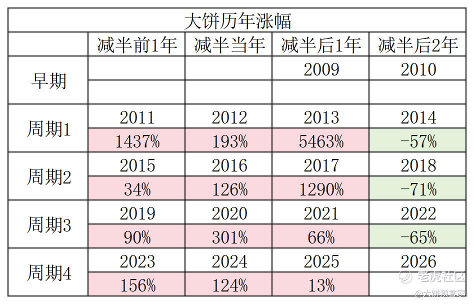 所以这个事情的本质就是,大饼的4年周期,是由大饼自己的算法决定的,这个算法指的就是大饼每4年的产量减半。只要减半的时间不变,4年周期就会永远有效。