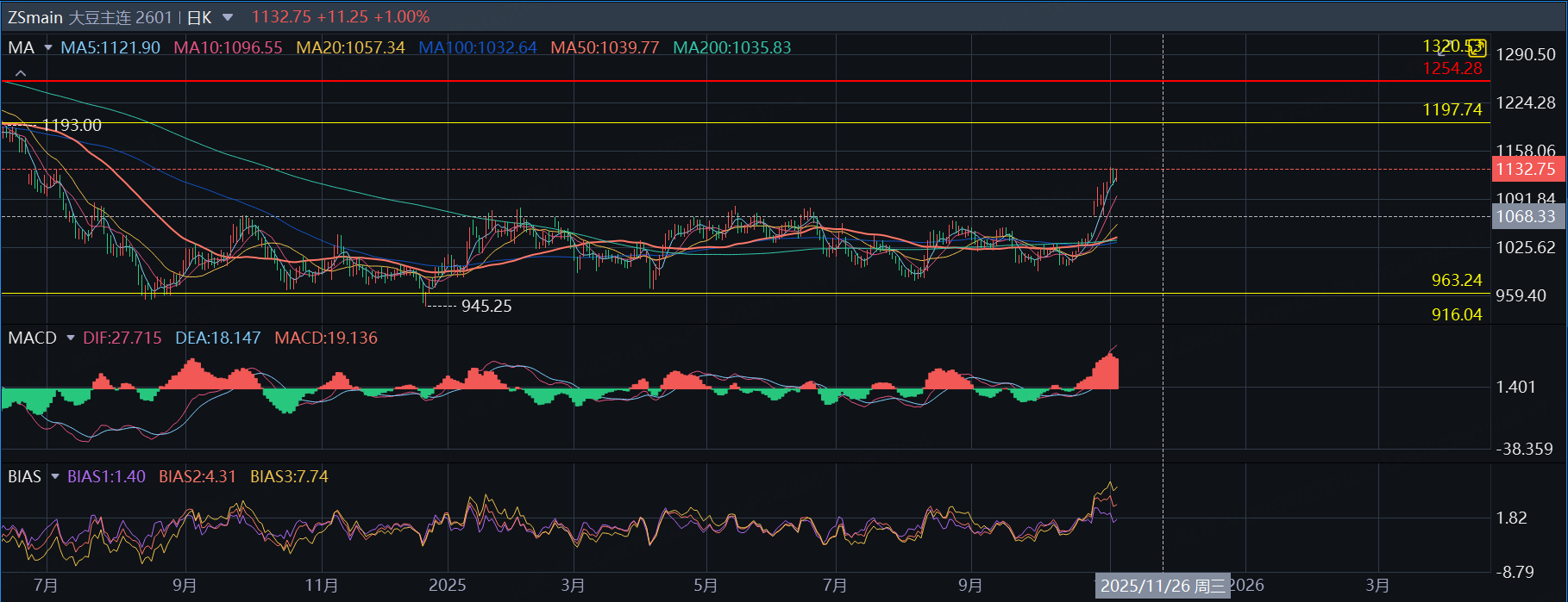 据外媒报道,2025年10月下旬起,中国大量采购美国新季大豆货源。美财政部长公开表示未来三年内中国每年还将采购超过2千万吨美豆。供需格局边际骤变,强劲买盘极大推高期货价格。