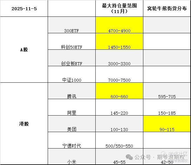 下图是今天大A的3个ETF和中证1000,以及港股的腾讯、阿里、美团、宁德和小米的最大持仓量范围以及窝轮牛熊分布范围,也就是11月的期权筹码分布,黄色的表示跟上个交易日有变动。