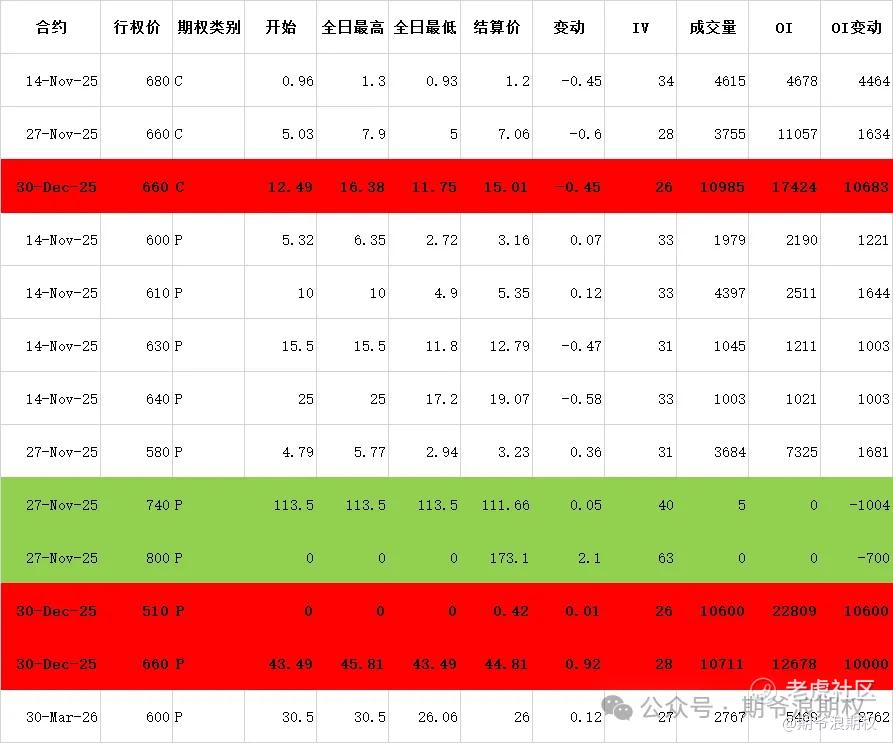 (4)宁德时代:11月最大持仓范围500/550-550,今收547.5,下跌0.09%。期权盘变化超过1000张的仓位如下,浅绿色是深度实值减仓,主要是12月410购减仓1000张,明显这个大户觉得后续涨幅有限,甚至会下跌。