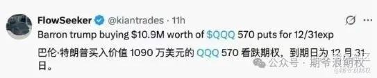 最近几天的热点是懂王的小儿子巴伦特朗普,有消息称,他最近买入了2万手价值1090万美元的纳指100(QQQ)的看跌期权,到期日12月31日,目标价570美元,昨夜美股收市619.25美元,还有近50美元的下跌空间。
