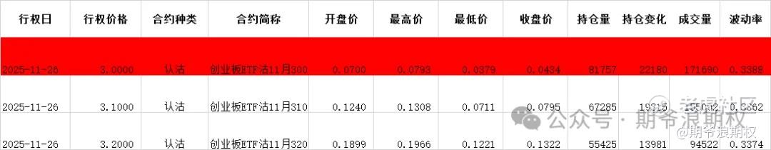 (3)创业板ETF期权:11月最大持仓范围3000-3300,今收3.142,上涨0.96%。期权11月主力合约,认购全部都是增仓,集中在2950-3700,合计5.0W张;认沽以增仓为主,集中2700-3200,合计8.8W张。市场看多的仓位仍然很进取,看空包吃悲观,喜忧参半。变化超过1W张的仓位如下,红色是增仓较大的。