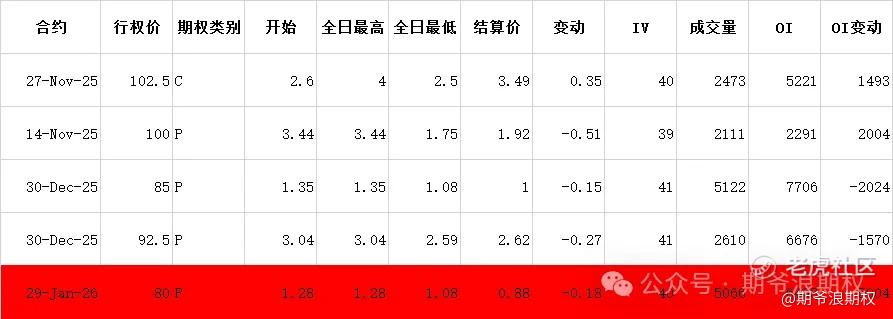 (3)美团:11月最大持仓范围100-130,窝轮牛熊街货分布90-115,今收101.2,上涨1.30%。期权盘路变化超过1000张的仓位如下,红色是增仓较大的,未来集市下跌,80是也是一个有效的支撑位。今天没有了大佬们大仓位主动做多的信号,但!是!,美团今天的表现不同寻常,过去几个月是众股皆涨我独跌,今天是众股皆跌我独涨。大佬们前两天的大仓位做多对不对,11月中发业绩的时候就知道了。