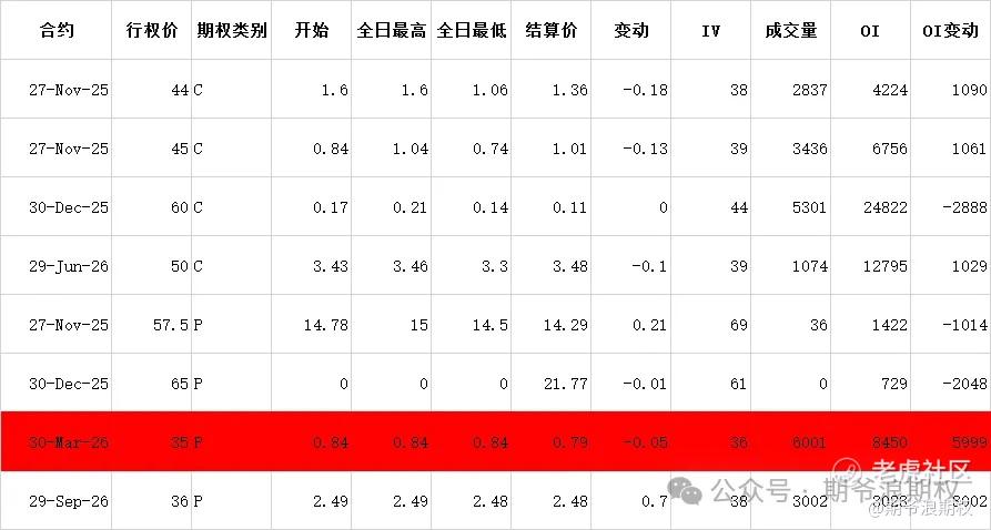 (5)小米:11月最大持仓范围45-55,窝轮牛熊街货分布42-50,今收43.32,下跌0.23%。期权盘路变化超过1000张的仓位如下,红色是增仓较大的。总体来说,是近月看微涨和盘整,远月看空。