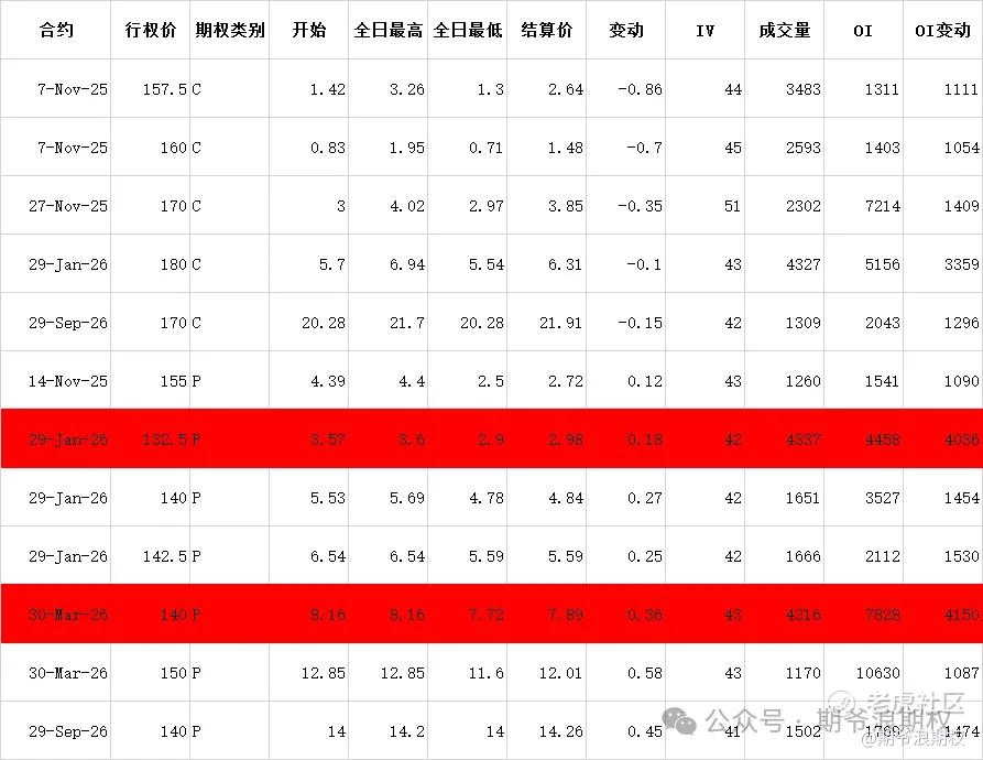 (2)阿里:11月最大持仓范围145-220,窝轮牛熊街货分布150-185,今收158.5,下跌0.09%。期权盘路变化超过1000张的仓位如下,红色是增仓较大的。总的来说,近期的仓位都是谨慎乐观,远期的都比较担忧。
