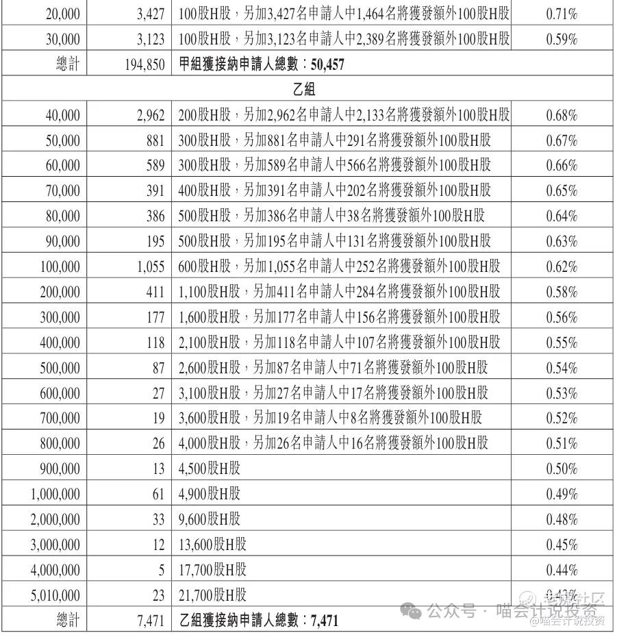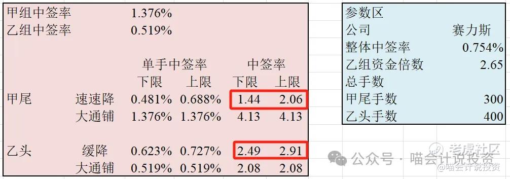 这次甲组是速降,甲尾中签率是甲组中签率的43%,乙组是正常的缓降,乙头中签率是乙组中签率的1.31倍。这次因为乙组申购资金不到甲组的3倍,所以甲尾的单手中签率略低于乙头。