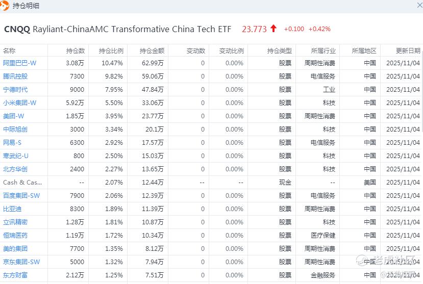 首先, CNQQ 的核心优势在于覆盖领域的全面性与选股逻辑的前瞻性,精准捕捉中国科技产业的创新脉络。与传统中国股票 ETF 不同,该 ETF 跟踪的 Solactive 华夏转型中国科技指数并非简单以市值为筛选核心,而是创新性地将企业 3 年研发支出占比纳入考量,在市值达标基础上选取前 100 家研发实力雄厚的中资企业,单只成份股权重上限设为 10% 的设计更避免了头部个股的过度影响。其覆盖范围拓展至汽车与交通运输、商业与消费服务技术、电子与电气产品、医疗健康技术、工业与制造技术、数字软件技术六大核心赛道,实现了对中国科技产业的全景式布局。在前十大重仓股中,既有宁德时代这样的新能源科技龙头,也有中际旭创、北方华创等半导体与高端制造代表,更包含寒武纪这一人工智能领域的 "新晋股王"。这种组合打破了传统科技 ETF 偏重互联网巨头的局限,将硬科技与数字经济、高端制造等国家战略赛道深度融合。