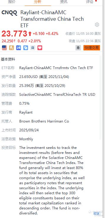 其次,24 小时全天候交易机制赋予 CNQQ 应对全球市场波动的灵活性,完美适配科技股的跨市场联动特性。科技产业的发展具有显著的全球化特征,美联储货币政策调整、国际科技巨头技术突破等海外事件均可能引发中国科技股的估值重构,而 A 股与港股的交易时段限制往往使投资者错失关键操作窗口。 CNQQ 依托纳斯达克市场的交易规则,实现了日间传统交易与夜盘运作的无缝衔接,让投资者能够在非 A 股交易时段及时响应全球市场动态。例如,当欧美市场出现重大政策调整或行业动态变化时,投资者可以通过夜盘交易迅速调整自己的投资组合,避免因时差导致的信息滞后和交易延误。这种全天候的交易模式,极大地提高了投资的灵活性和效率,使投资者能够更加精准地把握市场节奏,降低因时间因素带来的投资风险。