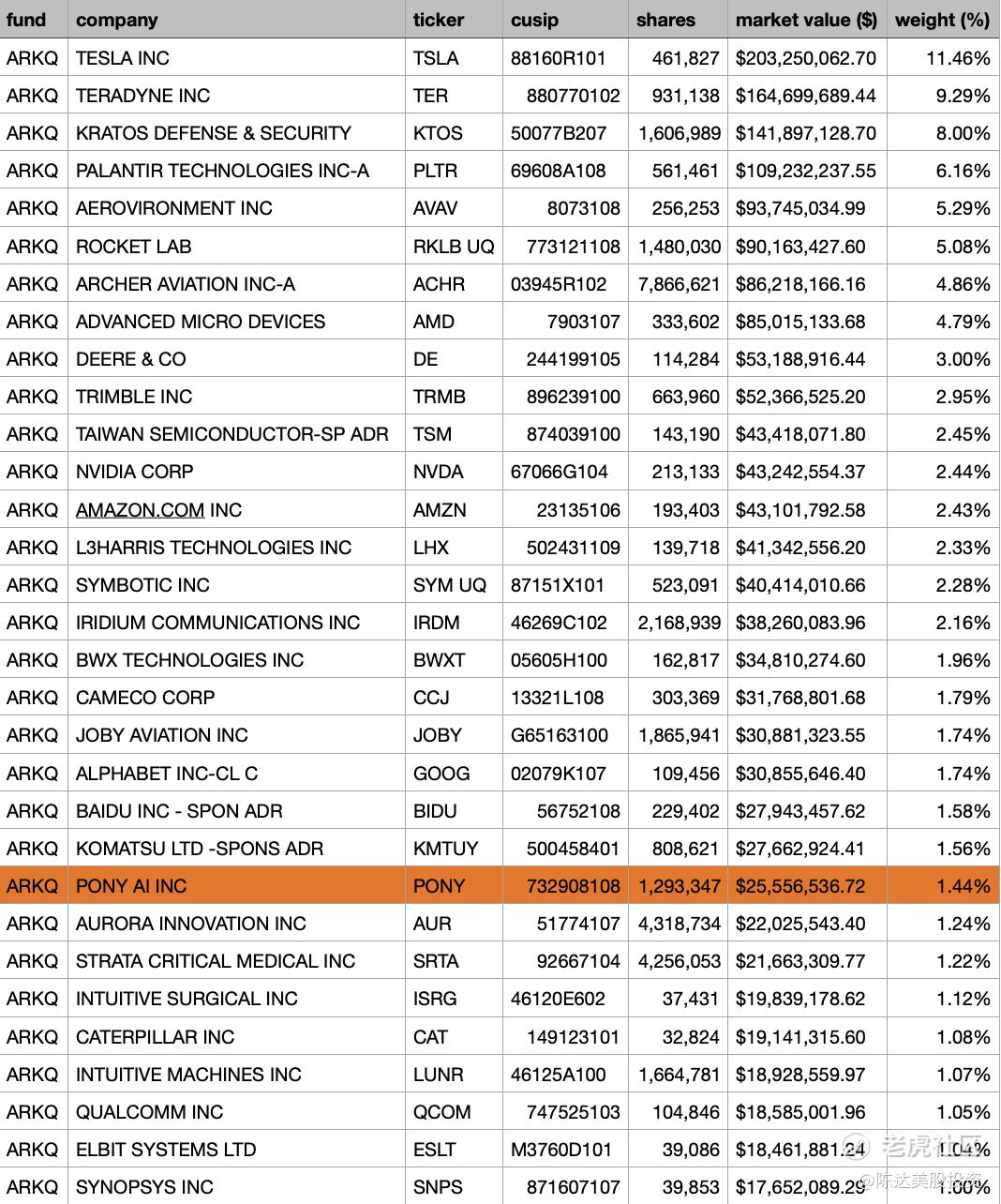二级市上对于小马比较利好的是木头姐的ARK INVEST在美股市场上有多次增持。目前ARKQ(ARK Autonomous Technology & Robotics ETF,ARK里专注自动化与机器人技术的那个基金)持仓2500万美元,数字不大但意义与象征性比较大,木头姐相中的Robotics领域的中国公司,除了百度以外能够在ARKQ里超过1%的持仓的,只有小马。鉴于ARK以及木头姐在科技领域“高山仰止,景行行止”的江湖地位,也算是街上对小马的一种认可。同时我也挺想知道ARK为啥没买文远。