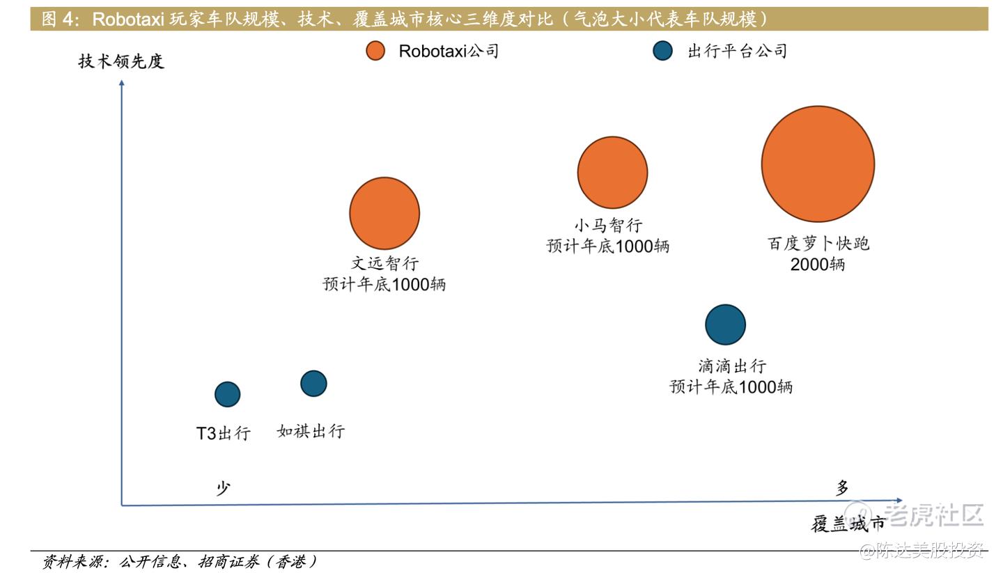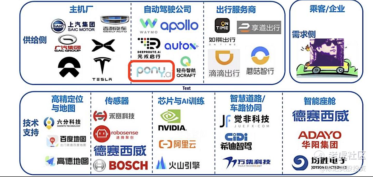 全球行业整体TAM规模就不赘述了,之前聊过很多,总之乐观预期下到2030年左右全球是500-1000亿美元的市场,到2035年——根据Frost &Sullivan——是3500亿美元。这个都是神棍拍脑袋,姑且一看。而以下是非常真实与现实的整个自动驾驶产业链生态,以及小马智行的定位。之于Robotaxi这个细分赛道,互相竞争的主要是三种公司,自动驾驶技术公司(小马、萝卜快跑等)、新兴车企(特斯拉、新势力等)以及出行平台(滴滴等)。