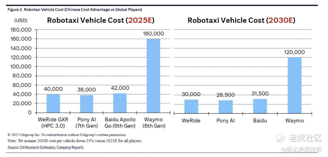 从整体成本控制来看,根据花旗估算的数据(见下表),百度的萝卜六代车,在传感器配置不错的情况下,将成本控制在30万人民币/42000美元之内。