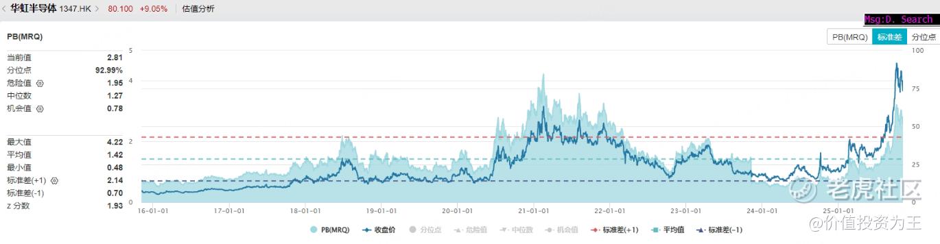 虽然华虹业绩有喜有忧,但随着股价暴涨,其市净率估值已经达到2.8倍,逼近2021年大牛市时高点: