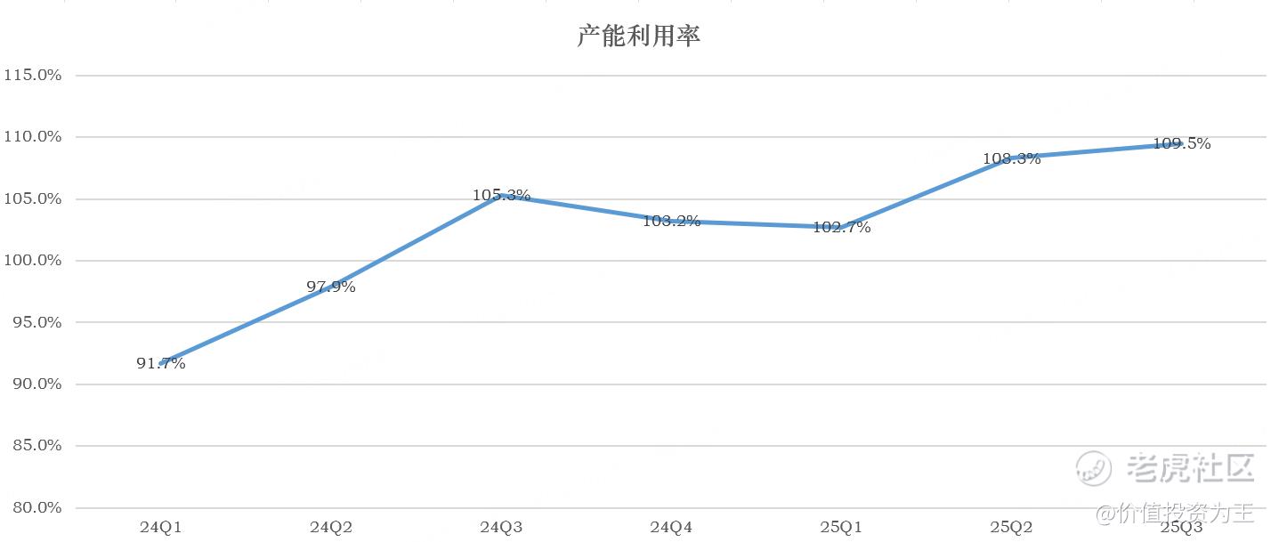 撇开指引不及预期,华虹三季度经营还是可圈可点的,比如三季度产能利用率高达109.5%: