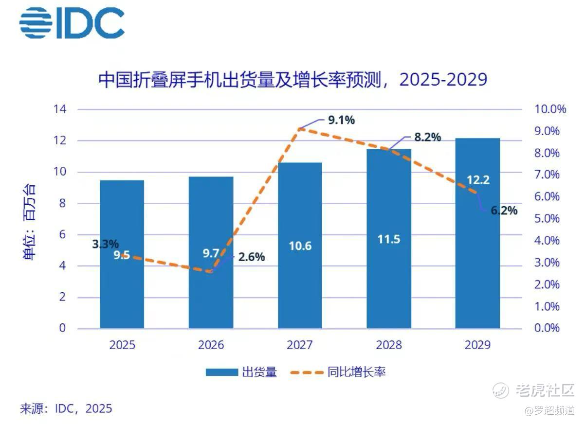 根据IDC最新预测,2025年中国折叠屏手机出货量预计达到950万台,同比增长 3.3%,并将在2029年突破1200万台。折叠屏正从高端小众迈向大众消费市场,成为手机行业增长的新引擎。
