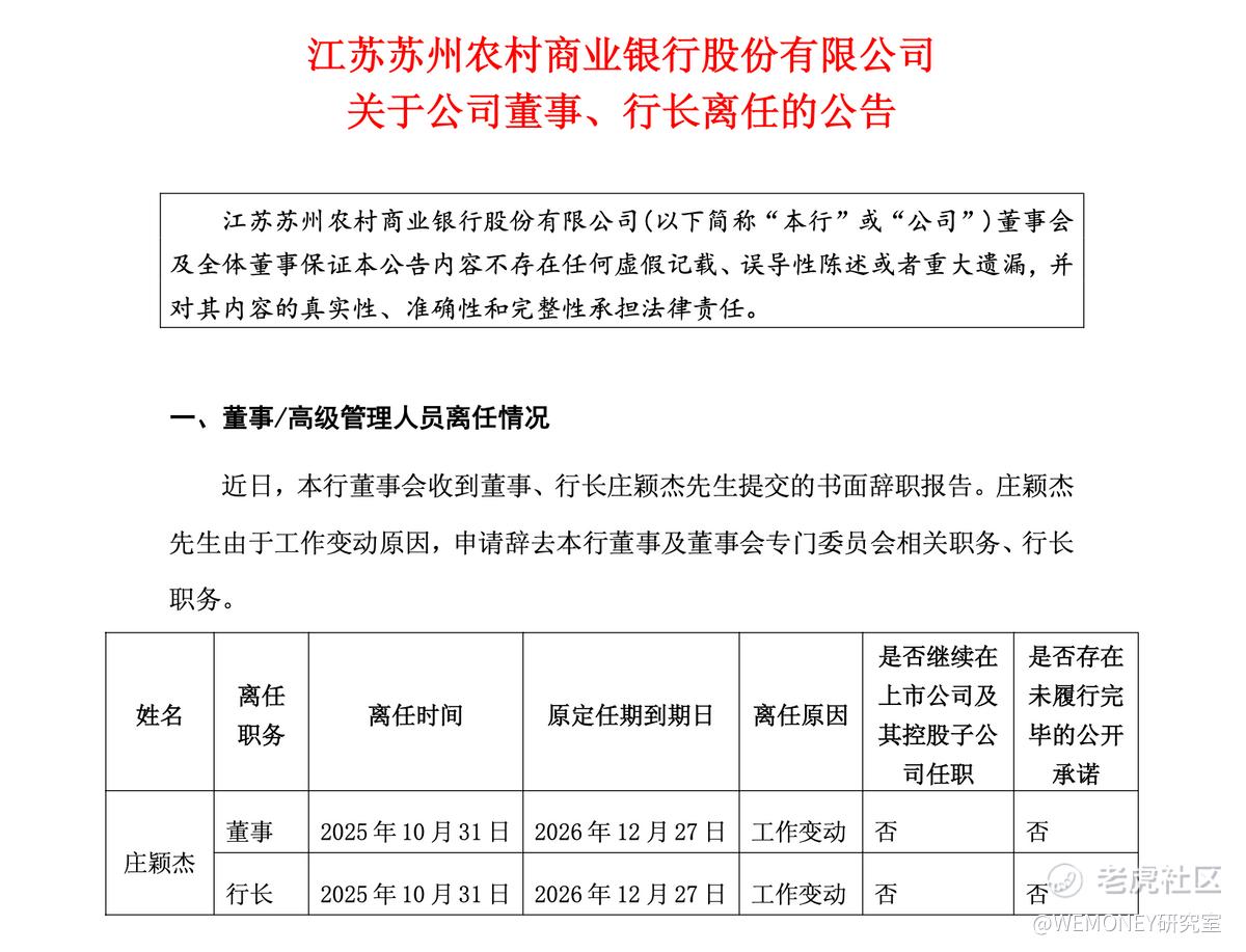 11月5日,苏农银行(603323.SH)发布公告称,董事会收到董事、行长庄颖杰提交的书面辞职报告。由于工作变动原因,庄颖杰申请辞去本行董事及董事会专门委员会相关职务、行长职务。