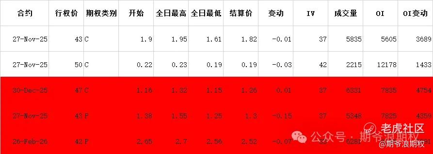 (5)小米:11月最大持仓范围45-55,窝轮牛熊街货分布40-62,今收43.44,上涨0.29%。期权盘路变化超过1000张的仓位如下,红色是增仓较大的。总体来说,小米这个月大概率会是窄幅震荡。
