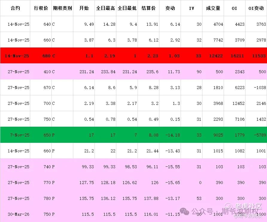 (1)腾讯:11月最大持仓范围600-700,窝轮牛熊街货分布595-705,今收644.0,上涨2.38%。期权盘路变化超过1000张的仓位如下,红色是增仓较大的,绿色是减仓较大,粉色是深度实值增仓。这两天大户们把墙头草演绎得淋漓尽致,多方昨天还纷纷跑路,今天除了把昨天跑掉的仓位补回来,还增加了很多额外的看多仓位,反正就是看多看多看多。不止我们小散,港股的大户也被懂王父子刷的团团转。