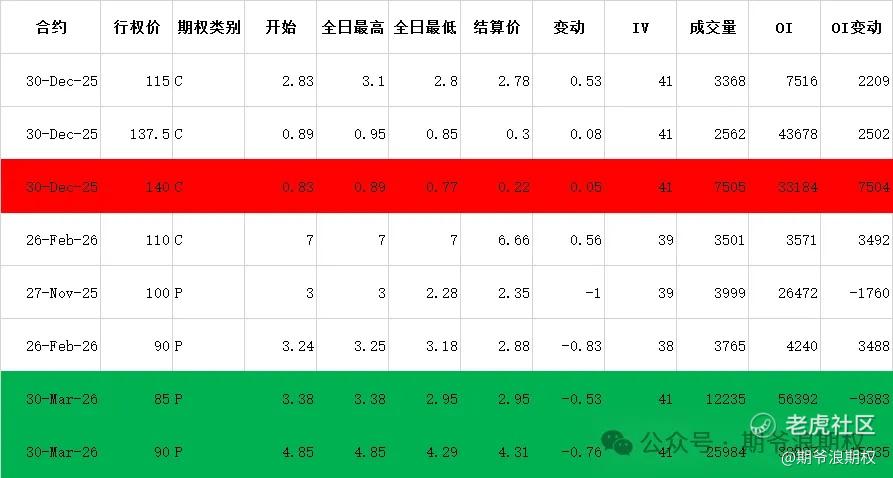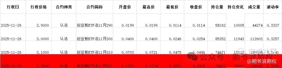 (3)创业板ETF期权:11月最大持仓范围3000-3300,今收3.201,上涨1.88%。期权11月主力合约,认购是低行权价减仓高行权价增仓,减仓集中在3100-3300,合计1.8W张,增仓集中在3400-3700,合计1.1W张;认沽以增仓为主,集中2850-3300,合计8.0W张。市场的支撑位在往上移。变化超过1W张的仓位如下,红色是增仓较大的。
