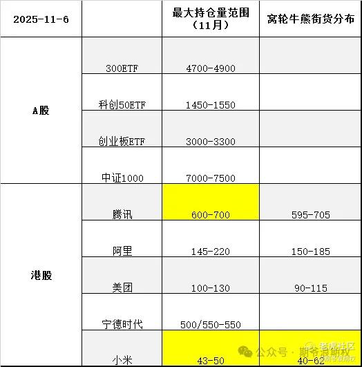 下图是今天大A的3个ETF和中证1000,以及港股的腾讯、阿里、美团、宁德和小米的最大持仓量范围以及窝轮牛熊分布范围,也就是11月的期权筹码分布,黄色的表示跟上个交易日有变动。