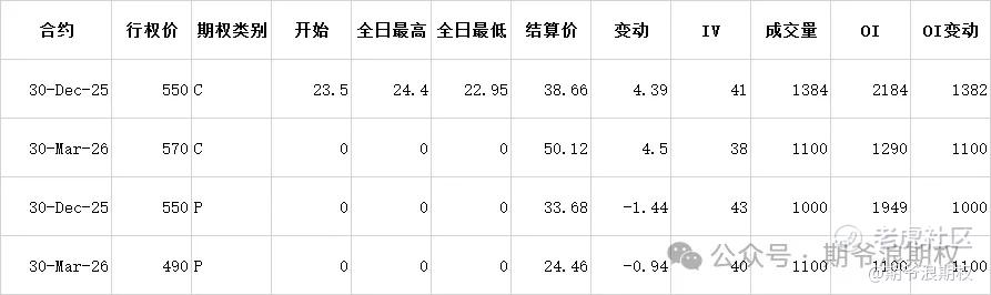 (4)宁德时代:11月最大持仓范围500/550-550,今收554.5,上涨1.25%。期权盘变化超过1000张的仓位如下,明年3月份的两个仓位增仓都是1100张,感觉像是某个持有1100手的大户给自己的股票做的领口策略。总的来说,市场对宁德的看法也是乐观,但有限。