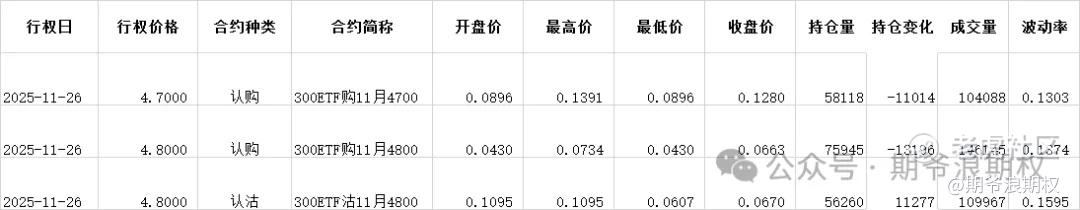 (1)沪深300ETF(沪)期权:11月最大持仓范围4700-4900,今收4.805,上涨1.48%。期权11月主力合约,认购几乎全是减仓,集中在4600-5000,合4.6W张;认沽以增仓为主,集中在4600-4900,合3.1W张。市场比前几天都活跃,从悲观变得乐观。变化超过1W张的仓位如下: