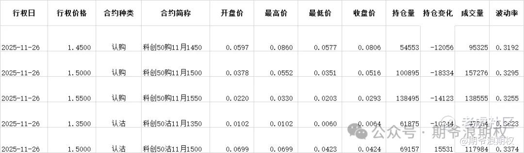 (2)科创50ETF:11月最大持仓范围1450-1550,今收1.509,上涨3.36%。期权11月主力合约,认购以减仓为主,集中在1400-1600,合计5.4W张;认沽1300减仓1.0W张,其他以增仓为主,集中在1400-1500,合计3.1W张。相比昨天,今天的市场乐观一点。