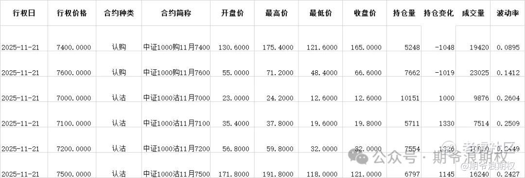 (4)中证1000期权:11月最大持仓范围7000-7500,今收7551.83,上涨1.17%。期权11月主力合约,认购以减仓为主,集中在7200-8400,合计6200张;认沽以增仓为主,集中在6800-7500,合计7000张。变化超过1000张的仓位如下