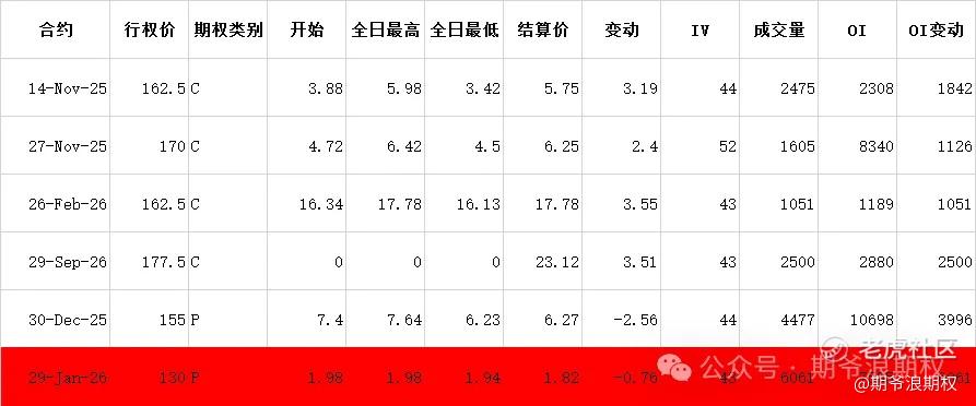 (2)阿里:11月最大持仓范围145-220,窝轮牛熊街货分布150-185,今收165.0,上涨4.10%。期权盘路变化超过1000张的仓位如下,红色是增仓较大的。市场对阿里也是看涨,但相比腾讯,要保守一些。