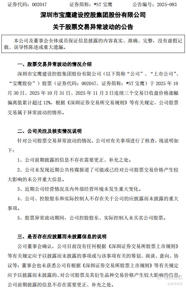 11月4日,*ST 宝鹰发布《于股票交易异常波动的公告》,就相关事项进行详细说明(见截图)。