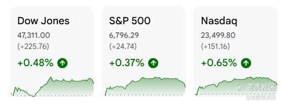 截至收盘,主要指数全线收高,道指涨幅为0.48%;纳指涨幅为0.65%;标普500涨幅为0.37%。