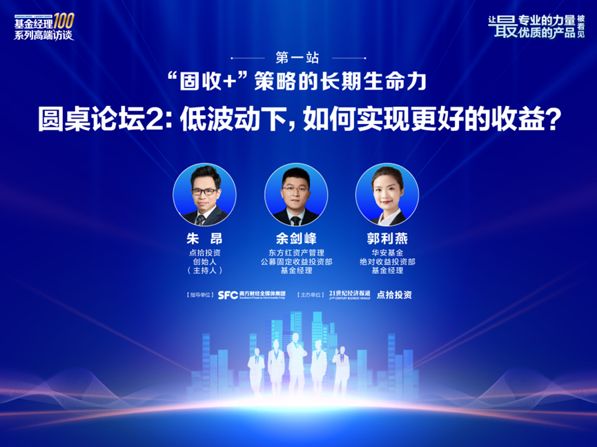 导读:10月22日,点拾投资举办了“固收+”策略长期生命力的线下活动。此次活动,我们邀请到了多位业内“固收+”大咖来到现场进行分享。在“低波动下,如何实现更好的收益”圆桌论坛环节中,我们邀请了来自东方红资产管理的基金经理余剑峰和华安基金的基金经理郭利燕,共同探讨了如何在低波动的约束条件下,给客户带来更好的收益。