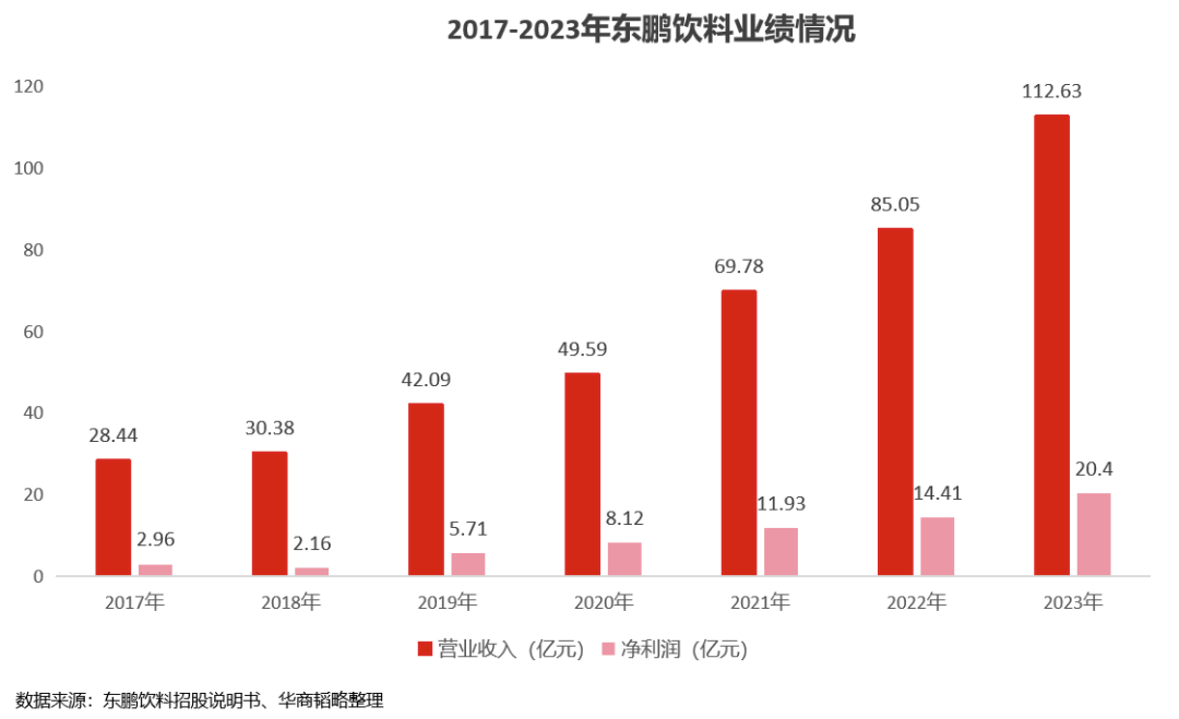 2023年,东鹏饮料销售额达112.63亿,净利润20.4亿,是全国化刚开始时的十倍。