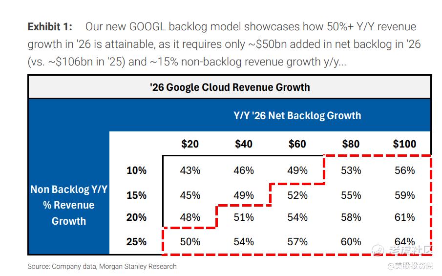 大摩的敏感性分析表明,只要2026年净新增积压订单达到约500亿美元以上(远低于2025年预计的1060亿美元),同时按需业务保持15%以上增长,谷歌云收入增速就能突破50%。即便按需业务维持25%的同比增长,新增积压订单仅为200亿美元,也能实现50%以上的收入增速。