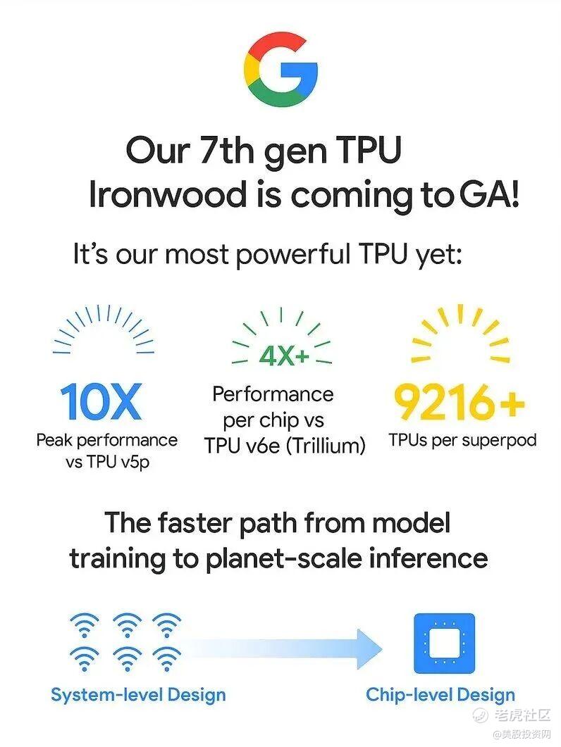 据美股投资网了解到,它即将推出性能大幅跃升的第七代张量处理单元(TPU)Ironwood。这不仅是谷歌在硬件军备竞赛中的一次强势亮剑,更是对其独特AI战略的一次有力证明。