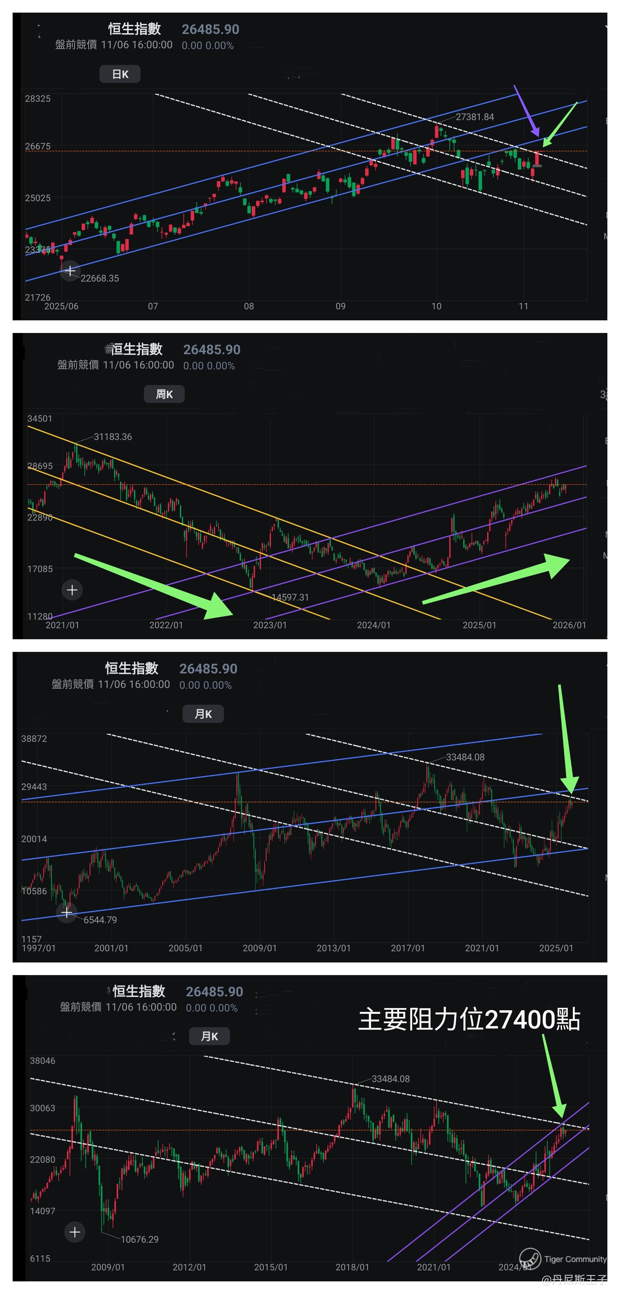 从恒生指数周线图和月线图所见,主要阻力位是27400点。