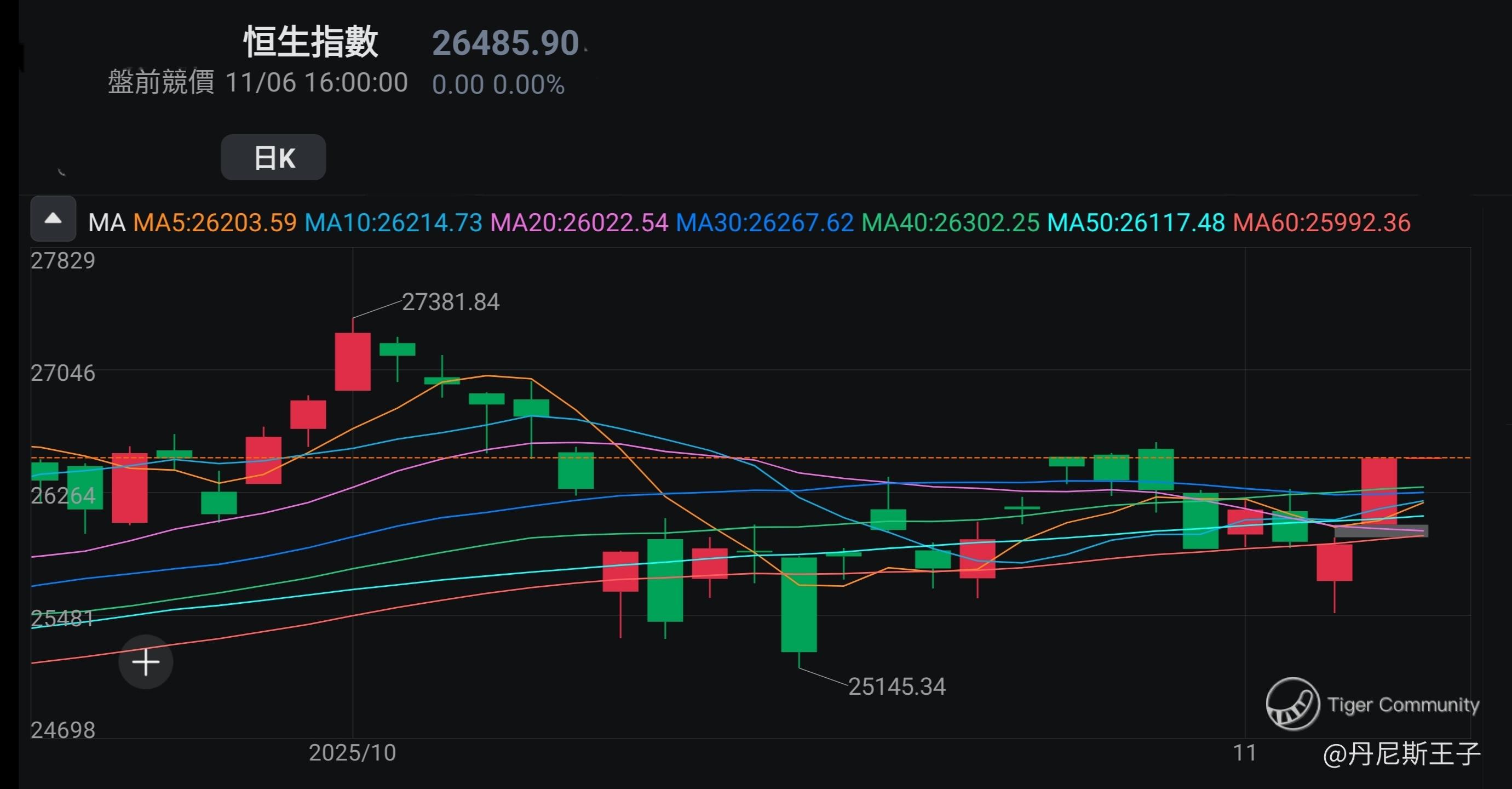 恒生指数站于(5,10,20,30,40,50,60)天移动平均日线之上。