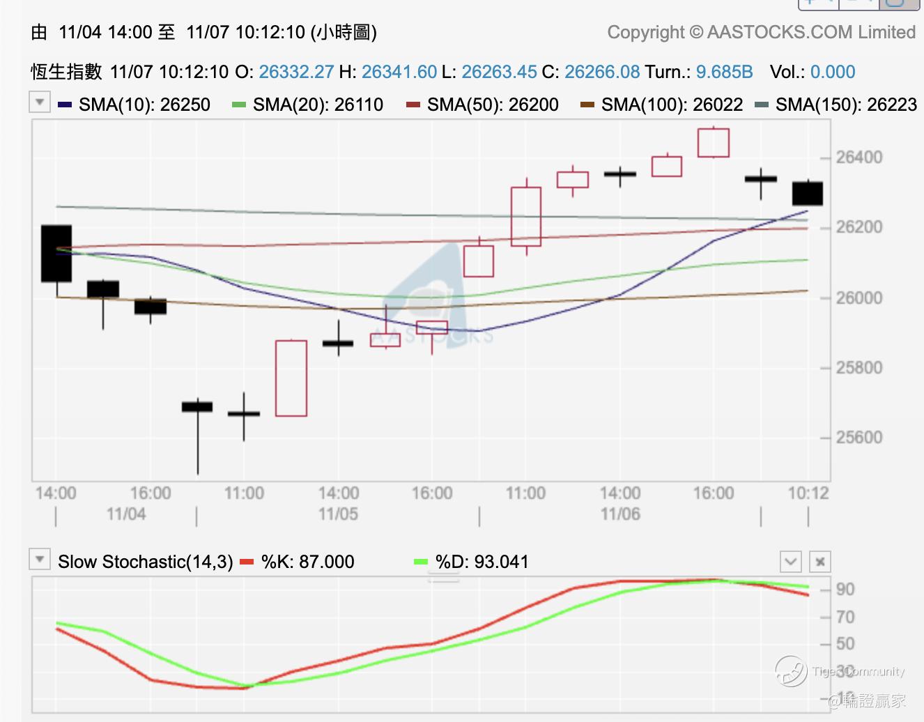 10点后见小时图10线率先追上,现时(10点3分)见10小时线为26252点,同 $HSI(HSI)$ 现价争40点位。
