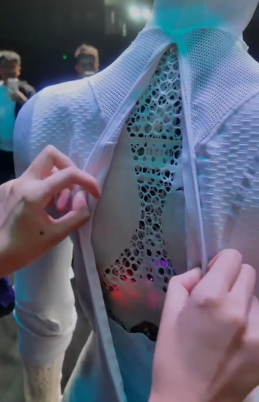 11月6日上午,何小鹏通过其个人微博发布视频,还原IRON走猫步的全过程,并让工作人员拉开IRON背后的拉链,全方位展示其内部构造,包括背部的晶格肌肉与控制器、肩膀的运输固定器等。