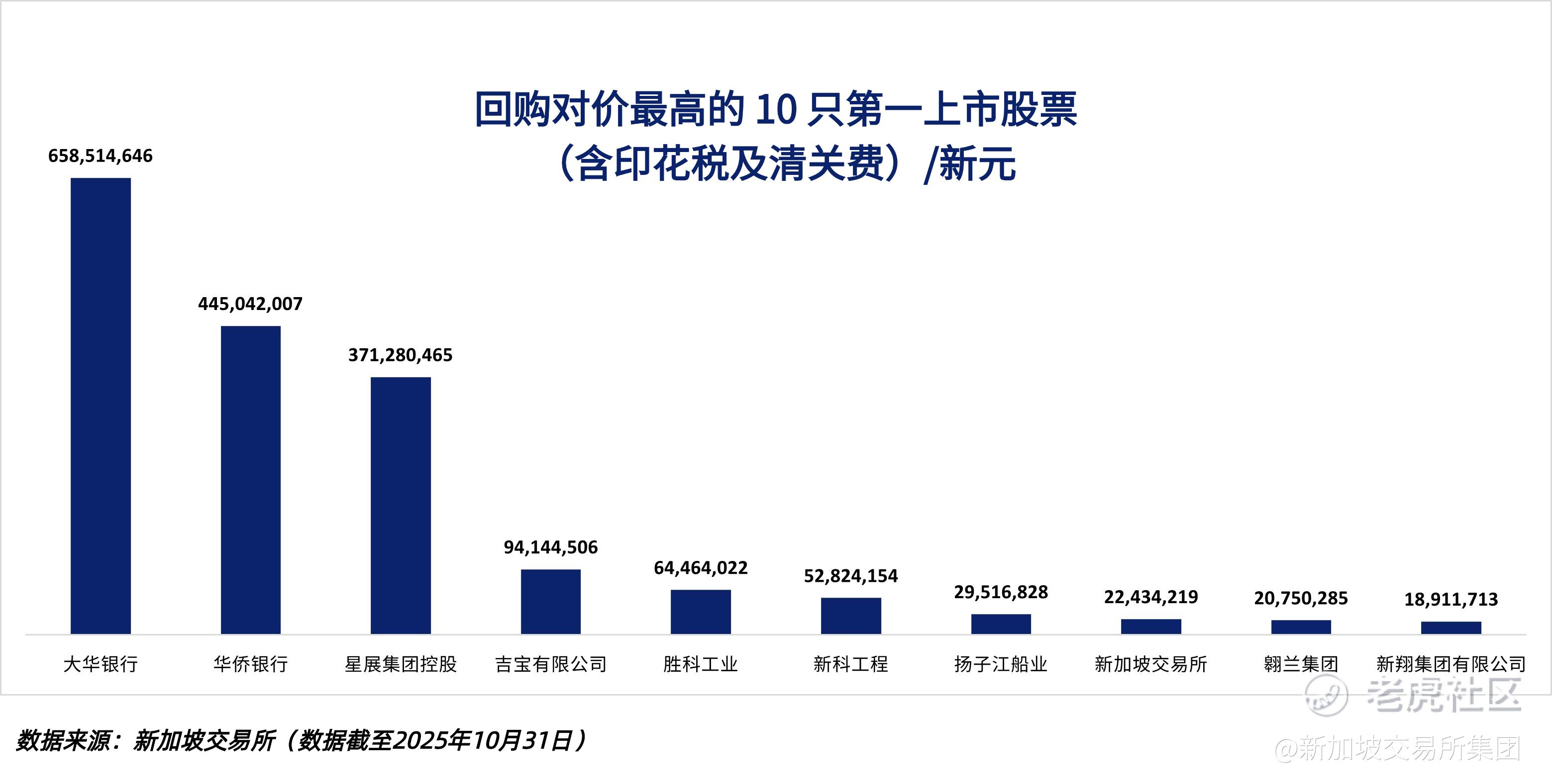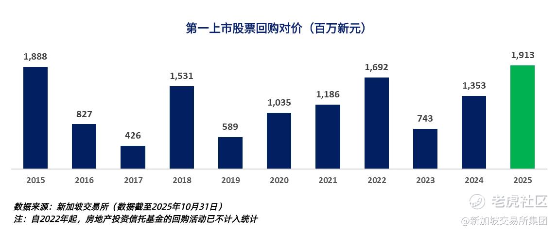 2025年前10个月,78家新加坡第一上市公司在公开市场累计回购价值19.1亿新元的股份,较2024年同期的10.1亿新元显著增长。这创下自2015年18.9亿新元回购对价以来的年度新高。这两年的共同特征是市场出现显著波动。2015年8月至9月期间新加坡海峡时报指数(STI)下跌13%,恰逢当年总回购对价的一半;而今年4月前两周8%的跌幅,则贡献了今年迄今19.1亿新元回购对价的约四分之一。